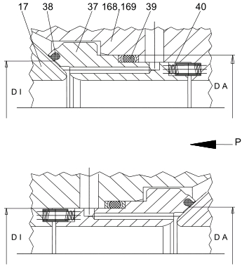 壳连接件?(168?,169)?之间的密封。通径密封元件在结构设计上是这样安排的,??与压力方向无关(?无论来自管道还是外壳内部)地在直径?D?A?和?D?I?之间形成不同的压力面。??因此通过介质能够自动均匀地产生平面压力作用在主密封?(38)??上。